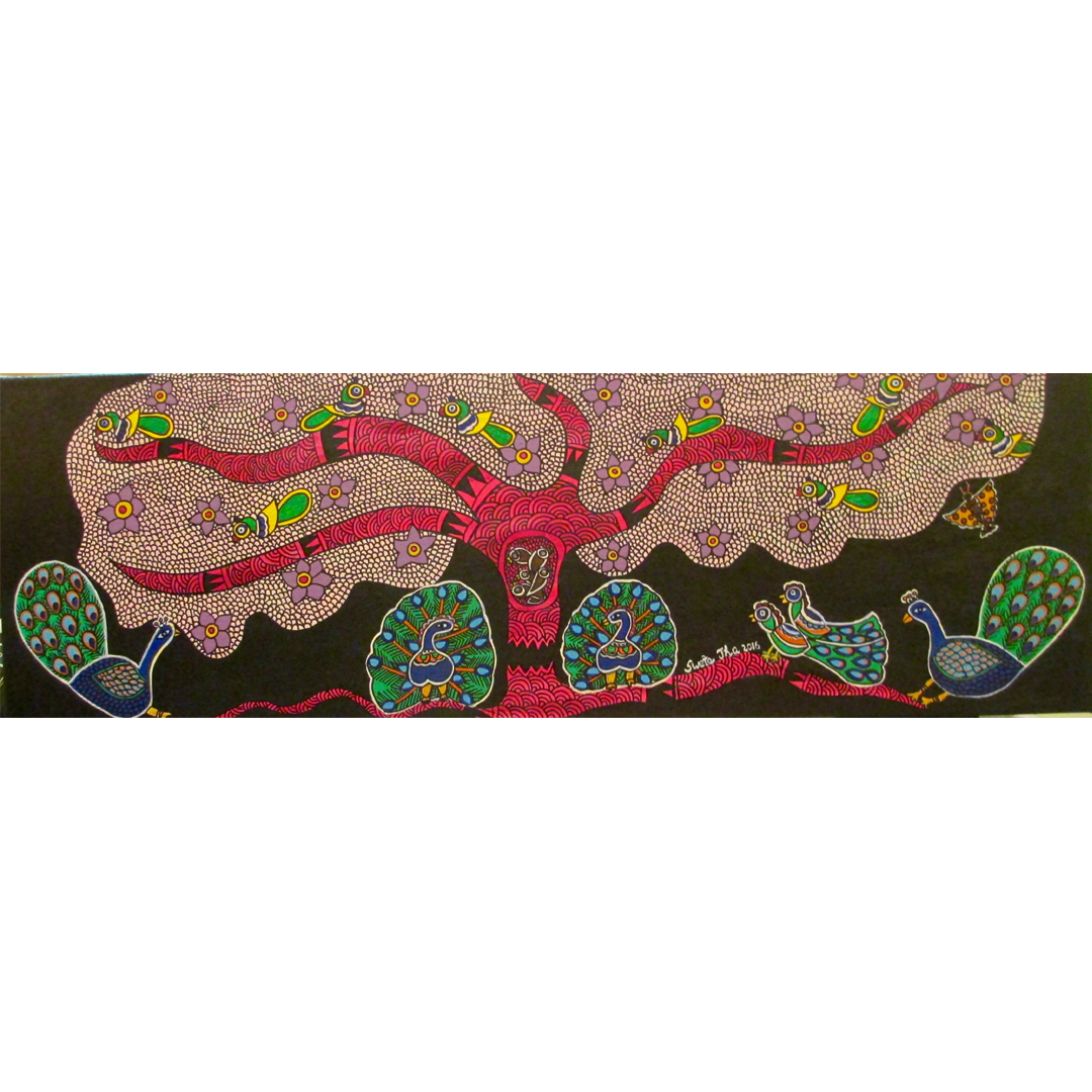 “AASHRAY” generally means shelter. In the shades of its branches, peacocks sit in pair. Shown here is the divine Tree that gives us food, shelter and prosperity.