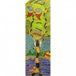 The art form is characterized both by the high level of repetitive detail and also the absence of any unfilled space. In this harmonious depiction of nature, a royal elephant strolls along proudly, while peacocks on the branches above look on.