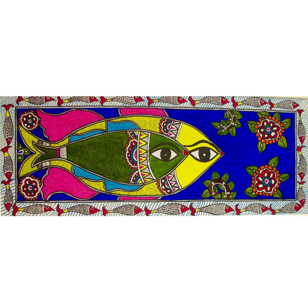 Traditionally a celebration of nature’s harmony, Madhubani paintings are a uniquely Indian art form. Depicted here are two fish, one inside the other. While all around, baby fish frolic in the waters