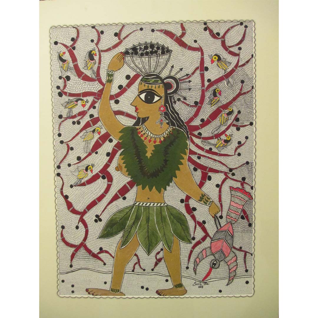 A Lady of a jungle. In earlier years back, women of rural India wore dress made of green leaves. The each and every body parts had their own leafy and flowery ornaments to wear. The change in jewelleries has been come along with the evolution of clothing. In this painting the lady is going to sell the berries which are she picked from the jungle.