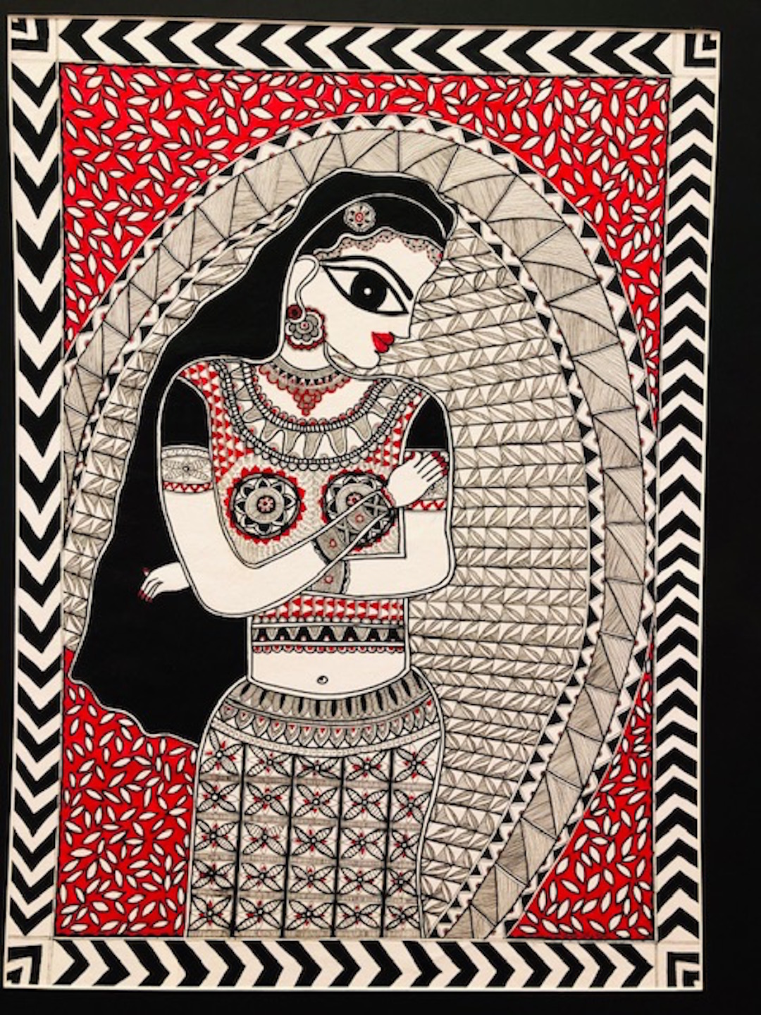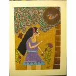 Beautiful Madhubani art with all the finesse of an aristocratic lady. Graceful views of beautiful women engaged in personal grooming or adornment convey the erotic side of the Indian system of aesthetics. This type of art depicts the ‘adornments’ that enhance a women’s beauty. These include hair ornaments, ears, nose, necklaces, arm bracelets and kohl outlining her eyes. This painting is in monochrome style in madhubani painting.
